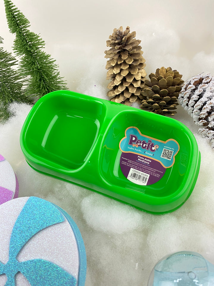 PLATO DOBLE DE PLÁSTICO • Comedero y bebedero en una sola pieza.• Plástico seguro para tu mascota (polipropileno), no tóxico.• Libre de BPA*.• Gomas de silicón antiderrapante.• Agarraderas laterales para fácil transportación. *BPA: El...